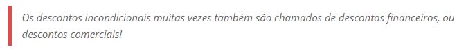O desconto incondicional é aquele concedido independente de qualquer condição, ou seja, não é necessário que o comprador faça qualquer ato posterior à compra para obter o benefício.