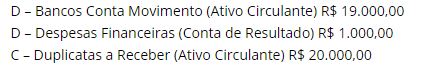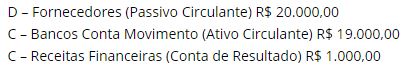 Vamos imaginar que que uma determinada empresa pagou uma duplicata do valor de R$ 20.000,00, obtendo um desconto de 5% (R$ 1.000,00) por ter efetuado o pagamento 15 dias antes da data do vencimento.